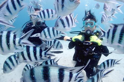 美ら海水族館がある「海洋博記念公園」で1975年に開催された沖縄海洋博覧会で日本政府が出展した海上都市アクアポリス。 そのアクアポリスは1993年に閉館し2000年に撤去されましたがその跡地はまだ水中に残っており実は今でもダイビングで見に行く事が可能となっているんです。